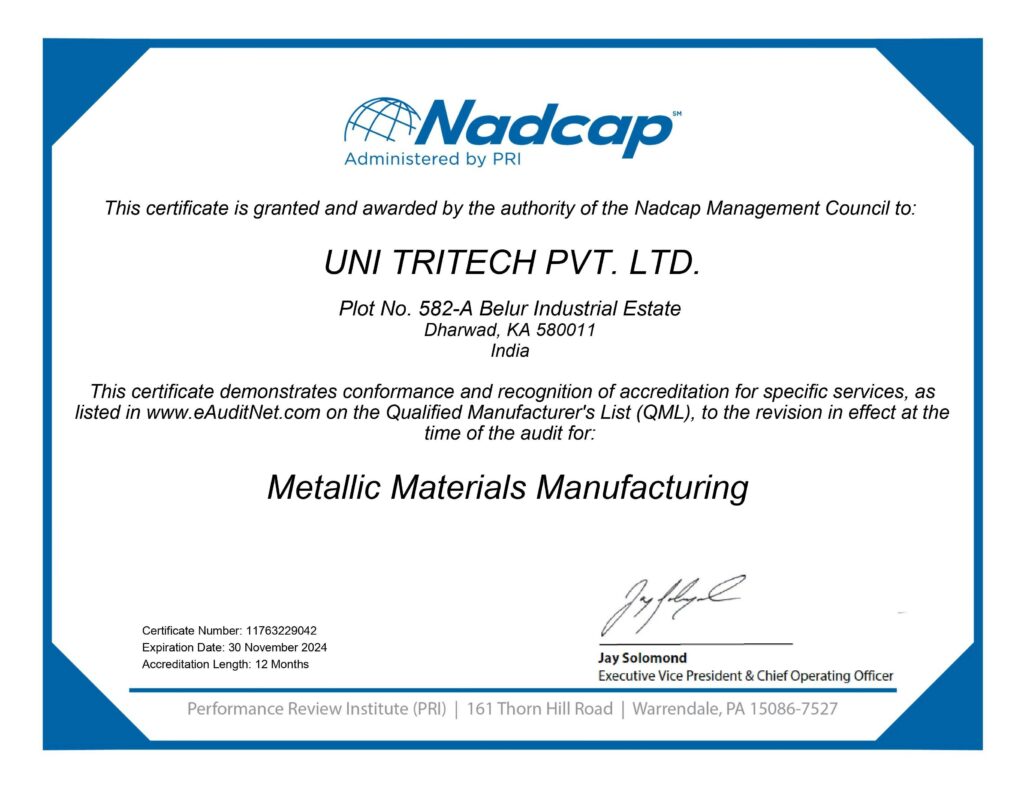 Uni Tritech Achieves Historic Milestone with NADCAP Certification becomes the 1 st Investment Casting Foundry in Asia and 3rd in the globe to receive a certification for its Metallic Materials Manufacturing (MMM) Processes.